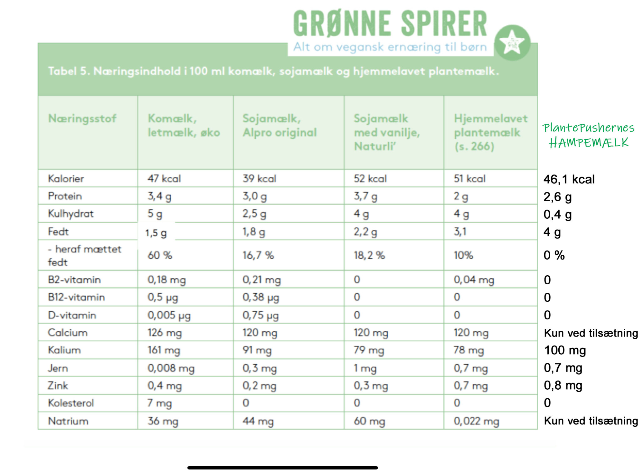 Her kan du se sammenligningen med en række andre plantemælk – og komælk. Jeg har fået lov at låne diætist Maria Feldings oversigt, som er lavet i forbindelse med udgivelsen af bogen Grønne spirer om Vegansk mad til børn. Og så har jeg tilføjet ufiltreret hampemælk yderst til højre. Og den klarer sig rigtig godt i sammenligning: Hampemælk ligger f.eks. højt på protein, lavt på mættet fedt og masser af kalium. Desuden ligger det jo tårnhøjt på omega3 i forhold til de andre. Men fremgår ikke tydeligt af skemaether, da indholdet i de andre generelt ligger så lavt, at det ikke har været værd at tage med (ku’ du mærke min dis?). Indholdet af calcium i alle plantemælk både købt og hjemmelavet er tilsat. Det kan du også nemt vælge at gøre hvis du vil, jeg skriver i opskriften hvordan.